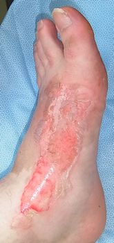 4月30日夕方,熱いお湯を左足にかけてヤケドした。以前から湿潤治療に興味を持っていたため,ラップを当て,翌日,当科を受診した。
