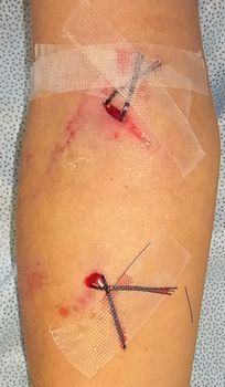 9月18日夜,帰宅途中で他の人が連れて歩いていた中型犬に右腕を噛まれた。直ちに当院救急外来を受診。抗生剤を処方され,創部を洗浄してガーゼを当てた。