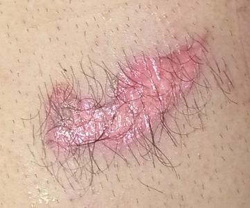 30歳男性。10年前より頚椎損傷で車椅子生活。 10月26日に何かで右大腿に熱傷。ネットで熱傷治療について検索し,当科を受診。 プラスモイスト(R)で治療。