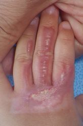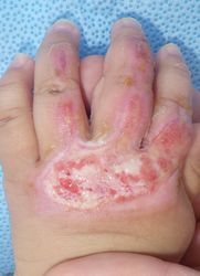 2013年4月3日にアイロンで左手背に熱傷受傷。〇〇大学△△病院形成外科を受診し,ソフラチュールガーゼとゲンタシン軟膏の治療を受けていた。深い熱傷で直ちに皮膚移植しないと手が動かなくなる,と説明された。両親が「手術をしない熱唱治療」についてネットで検索し,5月16日に当科を受診した。