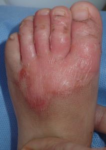 7月2日,キッチンの台の上に置いてあったティーポットに手を伸ばして倒し,左足背に熱傷受傷。ネットで熱傷治療について調べ,湿潤治療を行っている板橋区の双葉町クリニックで処置を受けているが,一度診てほしいとのことで当科を受診。