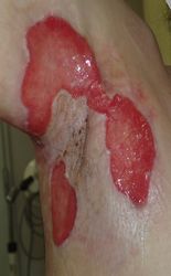 2015年4月18日,調理中に衣服に引火し,右前胸部〜腋窩部〜上腕に熱傷受傷。〇〇皮ふ科を受診て軟膏が処方され,△△病院皮膚科に紹介状を書いてもらい20日に受診。ゲーベンクリーム®とデルマエイドでの治療となり,医師から石鹸でゴシゴシ洗うように指導された。ゲーベンクリーム塗布後,痛みが激しくなった。その後,深いヤケドで皮膚移植の手術が必要と言われた。手術は絶対に嫌だったので,娘さんがネットで熱傷治療について調べてくれ,27日に当科を受診。