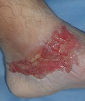 2015年5月16日,牛たん屋でバイト中にテールスープをこぼし,右足に熱傷。〇〇病院救急室を受診し,軟膏が処方された。その後は通院せずに軟膏を塗ってガーゼで保護していたが,5月23日に患部の痛みがひどくなり腫れてきたため,当院ER受診。プラスモイストで被覆し,内服の抗生剤処方。