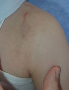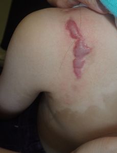 2015年8月8日,うどんを茹でていた鍋をひっくり返し,左胸部〜背部,上腕に熱傷。〇〇大学付属△△病院に救急搬送され,形成外科に入院。軟膏とガーゼで治療。11日に退院し,その後は同科に通院している。フィブラストスプレー®とワセリンが処方されていて,石鹸でよく洗うように指導されている。白い部分は深いので皮膚移植が必要と説明された。父親がネットで調べて当科を受診。