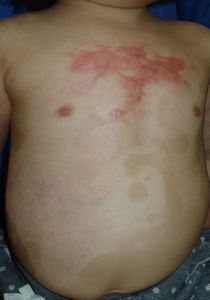 2015年9月27日,キッチンの台の上においてあったお茶を淹れるポットに手を伸ばして落とし胸腹部,左上肢に熱傷受傷。〇〇大学附属病院に救急搬送され,形成外科に入院となった。バラマイシン軟膏とフィブラストスプレー®,モイスキンパッドで治療だったが,治療のたびに絶叫して大暴れ状態だった。入院中から両親が「ヤケド 痛くない治療」でネット検索して湿潤治療を発見。9月30日に退院。