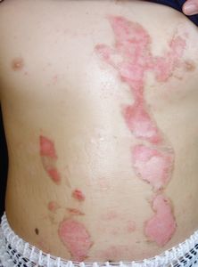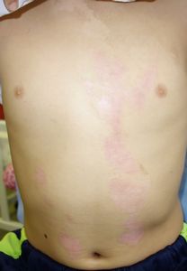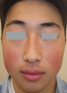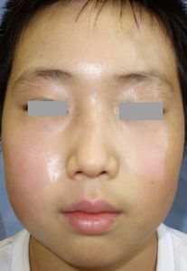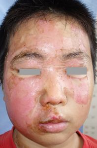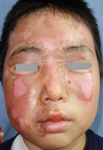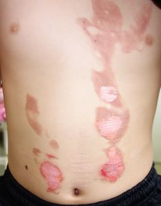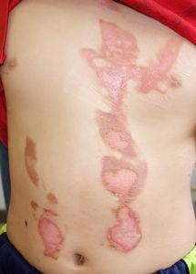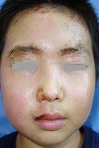 2016年9月30日,電子レンジで温泉卵を作っていて,卵をレンジから取り出した瞬間に卵が爆発! 顔面と胸腹部に熱傷受傷。〇〇病院救急室を受診。顔面はビジダーム,胸腹部はデルマエイドで治療。帰宅後,母親のママ友が,自分の子供が当科でヤケドの治療を受けてきれいに治ったことを教えてくれ,紹介状を書いてもらった。