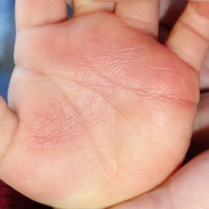 2017年1月11日夜,ストーブの上のヤカンに右手をつけてヤケド。〇〇病院救急室を受診し,軟膏で治療。翌日,△△皮膚科を受診しゲンタシン軟膏治療。その後,◇◇病院皮膚科を受診し,フィブラストスプレー®が処方された。14日,●●クリニックを受診。その後,ネットで調べて湿潤治療を知り,紹介状を書いてもらった。