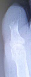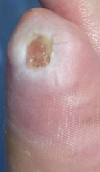 2017年今年1月初旬,左第5趾に胼胝ができて自然に剥がれたあとの傷が治らなくなり,骨が露出している状態が続いている。通院中の〇〇大学付属△△病院整形外科では「指を切断しないと骨髄炎から下腿切断になる可能性が高い」と説明された。数日後にリウマチで通院中の◇◇大学付属病院リウマチ科を受診したが,リウマチ科の主治医は「この状態でも切断しないで治療できるとしたら,日本では練馬光が丘病院 傷の治療センターしかない」と説明され,紹介状を書いてもらった。