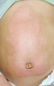 2017年5月14日,テーブルの上のカップ麺に手を伸ばして倒し,胸腹部熱傷。練馬光が丘病院に救急搬送され,プラスモイストで治療。