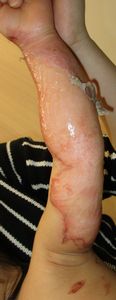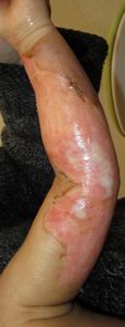 2017年12月11日夜,ファミレスで食事中に味噌汁のお椀に手を伸ばして倒し,左上肢に熱傷受傷。〇〇病院救急室を受診し,ゲンタシン軟膏とガーゼで治療。12日,同院皮膚科を受診。創部を石鹸洗浄したが,痛がって暴れる様子を見て母親は「この治療はおかしい」と直感し,直ちにネット検索。