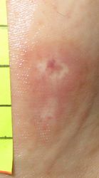 2017年12月8日朝,湯たんぽを使っていて左足に水疱ができていることに気付いた。〇〇クリニックを受診し,ゲンタシン軟膏とプロスタンディン軟膏が処方された。ネットで湯たんぽ低温熱傷について検索し,患者のブログから当院を発見。