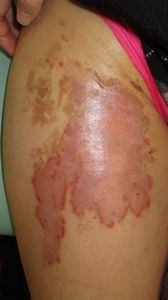 2018年1月6日,ヤカンの熱湯で右大腿に熱傷受傷。〇〇皮膚科クリニックを受診し,石鹸でよく洗うようにを指導され軟膏が処方された。