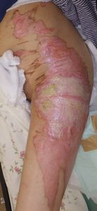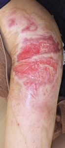 6月29日,当院を受診。すでに深い3度熱傷の状態であった。ズイコウパッドで治療。