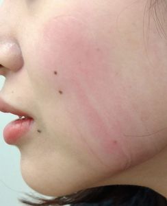 30歳女。 2019年12月21日,ヘアアイロンで左頬部に熱傷受傷。〇〇クリニックを受診し,ゲーベンクリームが処方されたが,治療の説明がまったくないため不安になり,帰宅後にネット検索。 12月24日,当院を受診。プラスモイスト ハイドロコロイド包帯 アドバンスで治療。