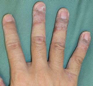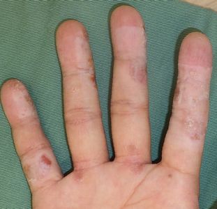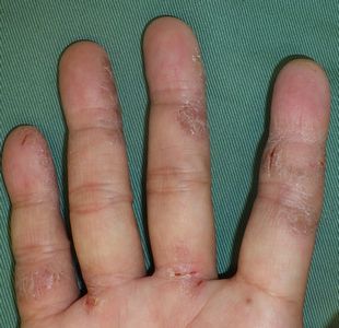 かなり前から右手指の手荒れがひどく,痒みがひどいため,いつも手を掻いている。病院を受診したことはなく、市販のハンドクリームを使っていたが、全く治らないため、ネットで検索して当院を受診。ハイドロコロイド包帯 アドバンスで被覆したところ,痒みは直ちに消失した。