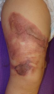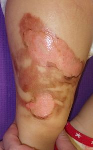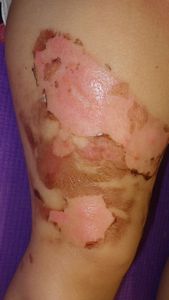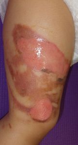 2021年12月10日,テーブルの上のお茶を落として両側大腿熱傷。〇〇大学△△病院に救急搬送され,アズノールとゲンタシン軟膏が処方され,石鹸でよく洗うように指導された。翌日,◇◇クリニックを受診したが,石鹸洗浄,軟膏とガーゼの治療だった。2週間後でないとヤケドの深さはわからない,と説明されたため、両親はネット検索。