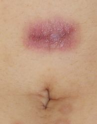 8月22日、当院を受診。臍部の頭側に直径3cmの壊死組織を認めた。プラスモイストで被覆して壊死組織の融解を待つ、と説明。