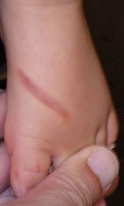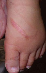 2022年10月8日、もんじゃ焼きの鉄板に左足をつけて熱傷受傷。〇〇クリニックを受診し、ステロイド軟膏が処方されたが、治療の説明がまったくなかったため、ネットで病院検索。