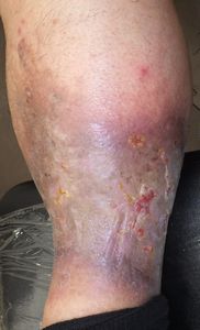 54歳M 数年前から両側下腿に傷ができて治りにくい、とのことで当院を受診。静脈うっ滞性潰瘍と考えられ、静脈瘤の治療をしなければ潰瘍は治らないことを説明。さらに、静脈瘤専門クリニックの検索方法を指導。