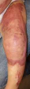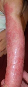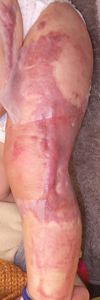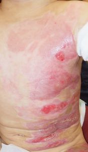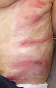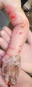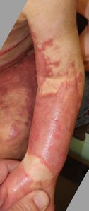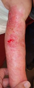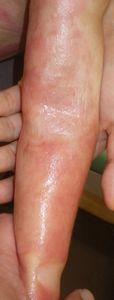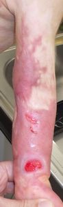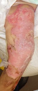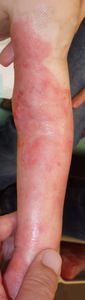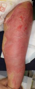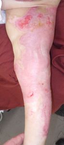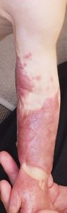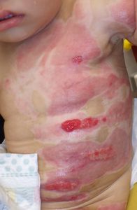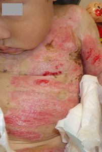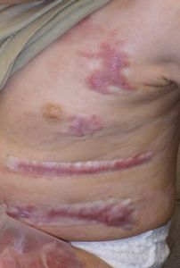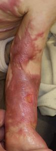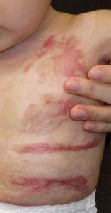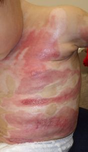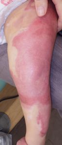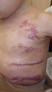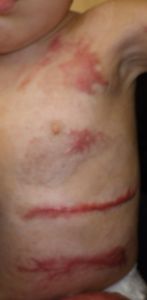 2022年8月30日夕方、父親が患児を抱っこしてソファーに座っていたら、後ろの棚の上でお湯を沸かしていたティファール電気ケトルが落下して左胸腹部、左上肢、左下肢にヤケド。〇〇病院に救急搬送され、小児科入院。治療は形成外科。9月10日にセカンドオピニオンで両親が当院を受診。