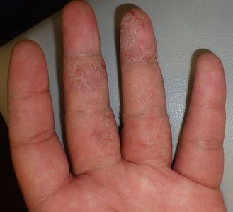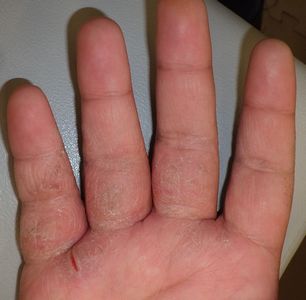 17歳M 1年前から両手の手荒れがひどく、亀裂の部分は痛みがひどい。 2022年10月12日、当院を受診。ハイドロコロイド包帯 アドバンスで被覆したところ、痛みは瞬時に消失。10月19日、軽い痒みがある程度となり、ワセリンの使い方を指導して通院終了。