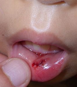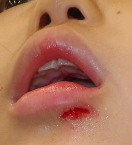 8歳F 2022年10月5日、自宅で転倒。直ちに当院を受診。歯牙による口唇貫通創。皮膚側はヘモスタパッドで被覆し、口腔内は開放創とし、口内炎の軟膏を処方。翌日には皮膚側の傷は閉じていた。