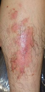 20歳M 2022年11月28日夜、飲食店でバイト中に揚げ物の油が左足にかかった。翌日、当院を受診。ズイコウパッドで被覆。