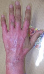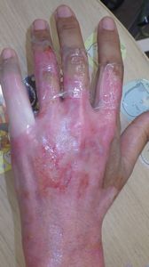 2023年6月29日、揚げ物をしていて油に引火し、慌てて鍋をひっくり返して両前腕にヤケド。〇〇大学附属病院に救急搬送され、以後は同院形成外科に通院。石鹸洗浄、軟膏ガーゼで治療。手術が必要になると説明された。夫が2018年に両手のヤケド(溶剤に引火)で皮膚移植を受け、その後に運動障害が起きて瘢痕拘縮形成術も受け、現在も運動障害が残っていて移植皮膚の醜形に悩んでいるため、皮膚移植は絶対に避けたほうがいいと考え、ネット検索。