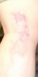 2023年8月12日夕方、テイクアウトのもつ煮込みが入ったビニール袋が右下肢に触れていて水疱ができていた。〇〇大学病院に救急搬送され、軟膏ガーゼで治療。14日、△△皮膚科を受診、石鹸洗浄が指示され、バラマイシン軟膏とメロリンガーゼ®で治療。当初、2週間で治癒すると説明されたが、2回目の診察日には「なぜかわからないが急に深くなっている」とと説明され、26日に壊死組織を溶かすためと説明されてブロメライン軟膏が処方された。28日、フィブラストスプレー®処方。受診のたびに説明がコロコロ変わるため、不信感を抱きネットで病院検索。