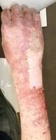 3月25日、当院を受診。顔面はハイドロコロイド包帯 アドバンスで被覆、右手はプラスチック手袋で治療。