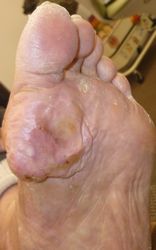 2023年11月ころから左足底に胼胝ができ、12月はじめに膿が出た。〇〇病院皮膚科に紹介されて受診。軟膏が処方された。その後、皮膚科では手に負えないと説明されて同院形成外科に紹介となったが、治療について質問しても回答なし。ネットで同様の症状について検索。