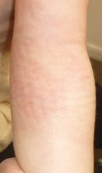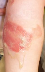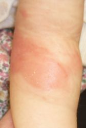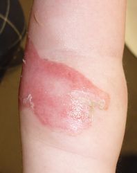 2024年12月16日夜、テーブルの上のマグカップを引っ張って落とし、顔、右前腕にヤケド。〇〇大学△△病院に救急搬送され、リンデロンVGが処方され、石鹸洗浄するように説明された。帰宅後、ネットで病院検索。