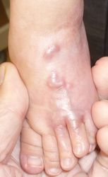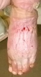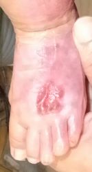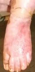 5月17日、当院を受診。メロリンガーゼが創面に固着していたため出血しヘモスタパッドで患部被覆。5月24日には上皮化したが、26日に発熱し、〇〇病院小児科を受診。手足口病だった。水疱ができて傷になり、足背は深い潰瘍となった。ズイコウパッド