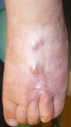 12月、傷が盛り上がってきたと再受診。エクラープラスターの治療を開始。第4趾に軽度の屈曲障害を認めるが、ステロイドテープによる瘢痕軟化で経過観察中。