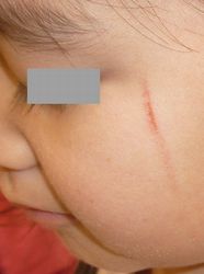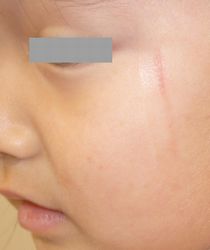 4歳6ヶ月F 2025年2月26日、保育園で他の園児に爪で引っかかれた。直ちに受診。ハイドロコロイド包帯 アドバンスで患部被覆。