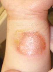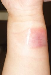 2月21日、当院受診。左前腕、手掌熱傷。ハイドロコロイド包帯 アドバンスで患部被覆。