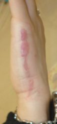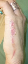 22歳F 2025年1月28日、ヘアアイロンで左手熱傷。ネットで病院検索。1月31日、当院を受診。ハイドロコロイド包帯 アドバンスで患部被覆。
