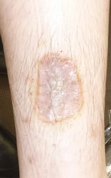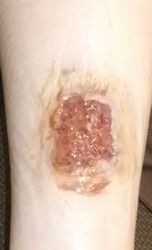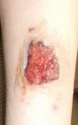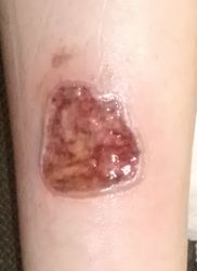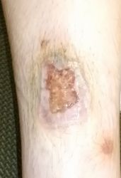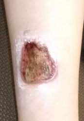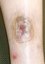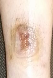 2024年4月10日、湯たんぽを使っていて右下腿に水疱ができた。〇〇皮膚科を受診、ゲーベンクリーム®が処方された。5月中旬、深い火傷と説明され、下旬に△△大学病院皮膚科に紹介状を書いてもらい受診。直ちに入院して手術と説明され、無麻酔でデブリードマンが行われたが、あまりの激痛にこの病院の野蛮な治療には耐えられないと帰宅後にネット検索。