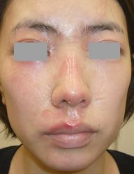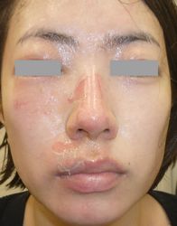 32歳F 2025年3月3日夜、レンチンした卵を取り出したところ爆発し顔面熱傷。〇〇病院救急室を受診し、顔はハイドロコロイドで被覆し、当院に紹介状。 3月4日、当院受診。ハイドロコロイド包帯 アドバンスで患部被覆。