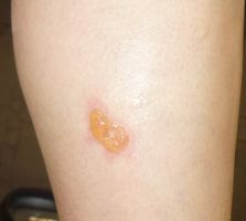 49歳F 2025年2月18日朝、湯たんぽで左下腿に水疱ができていた。以前、熱傷治療を受けたことがあり、直ちに受診。ハイドロコロイド包帯 アドバンスで患部被覆。