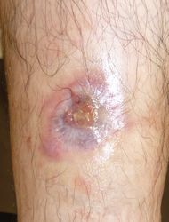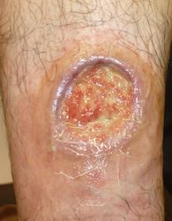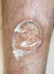2024年2月11日、湯たんぽで右下腿に水疱形成。近医を受診した後、〇〇市立病院形成外科を紹介されて受診。軟膏ガーゼ治療を数ヶ月続けたが治らないため、入院となり、陰圧閉鎖療法などが行われたが全く効果なし。1ヶ月後に退院となって外来通院となり、現在はゲーベンクリームが処方されていて、皮弁形成するしか治療法がないと説明された。さすがにこれはおかしいと思い、ネットで湯たんぽ熱傷について検索。