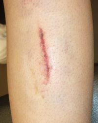 20歳F 2025年4月4日、大学の階段で転倒し右下腿を擦りむいた。翌日、当院受診。ハイドロコロイド包帯 アドバンスで患部被覆。
