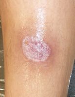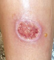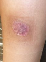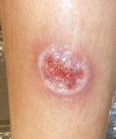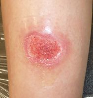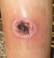 2025年2月3日、湯たんぽを使っていて左下腿に水疱。母親が熱傷で当院で治療を受けたことがあり、常備してあったハイドロコロイド包帯 アドバンスで患部被覆。2月10日、痛みがあり受診。2月14日、黒色壊死となりデブリードマン。ズイコウパッド
