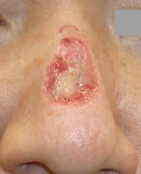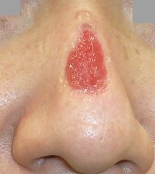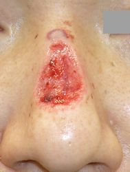 2025年3月7日夕方、上から落ちてきたステンレス板が顔に当たり出血。3月8日、キズパワーパッドを貼った状態で当院受診。ハイドロコロイド包帯 アドバンスで患部被覆。4月1日、仕事が忙しく、傷も小さくなってきたので、あとは自分で治療してみます、とのことで通院終了。