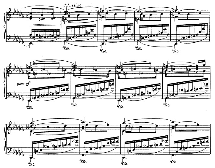 普通ならここは「嬰ト短調」で記譜されるだろう。だが,譜面を見た感じでは,「変イ短調」と「嬰ト短調」では全く違う(ピアノでは両者は同じだが,弦楽器などではこれらは異なった調性である)。ためしに「嬰ト短調」に書き換えてみると譜面は鋭角的で鋭く見え,「変イ短調」の譜面の持つ,ある種のほの暗さ,底知れぬ深さは感じされなくなり,この曲の雰囲気には全くそぐわない。