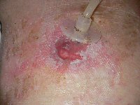 患者は80代の男性。寝たきりの患者さん。胃瘻造設を行ったが,胃瘻部に接触性皮膚炎を起こし,びらんを形成したため,当科紹介となった。