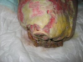症例は60代の男性。バイクの転倒事故で左膝下部分を完全切断の状態で救急ヘリで病院に搬送された。受傷日は確か11月10日頃だったと思う。膝下での完全離断であり,大腿部の皮膚・軟部組織の挫滅も高度であり,筋膜と脂肪層がほとんど剥離した状態であった(つまり,受傷時点で既に,皮膚への血流はほとんど絶たれていた事になる)。整形外科で直ちに大腿骨の短縮と創縫合を行ったが,術後,皮膚の循環が不良となり,当科紹介となった。