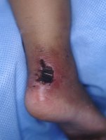 症例は3歳女児。他の病院で2ヵ月半,外来通院で治療(消毒してガーゼ,ゲンタシン軟膏,ソフラチュールなど)したが,「このままではアキレス腱が露出し,皮膚移植などの手術が必要になるだろう」ということで当科を紹介された。