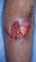 症例は70代半ばの女性。慢性腎不全のため,10年前から人工透析を受けている(週3回の透析)。自宅で転倒し下腿に受傷。直ちに救急車で病院を受診。下の写真を見てもわかるとおり,下腿外側に裂挫傷があり,筋肉が広範に露出。また長年の人工透析のため,皮膚は非常に脆弱で,普段からちょっとぶつかるたびに裂傷を繰り返していた。受傷前日に人工透析を受けていたため創全体から出血が続き,当直医(整形外科)が止血のため創を縫合したがそれでも染み出すような出血が止まらず,皮膚欠損もあるため当科紹介となった。